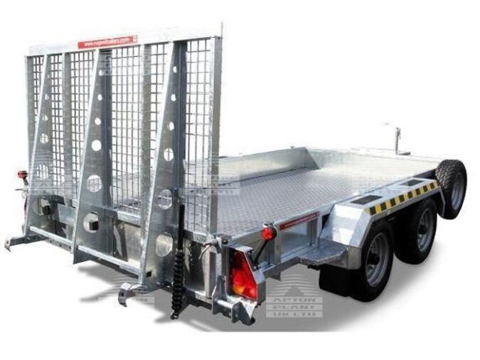 NEW, RAMP WITH INTEGRATED PROPSTANDS, BALL HITCH, TWIN AXLE, LIGHTS AND BRAKES, SPARE WHEEL, 12 MONTHS WARRANTY